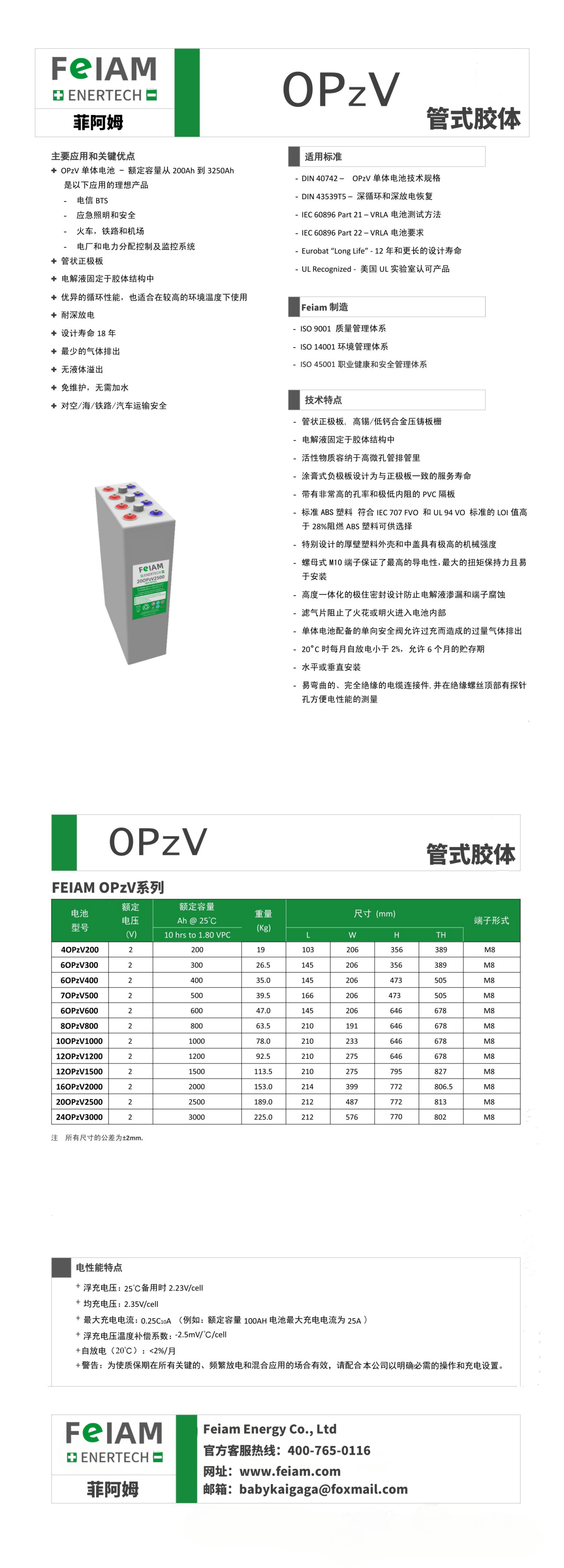 Feiam蓄电池OPzV管式胶体系列关键优点: